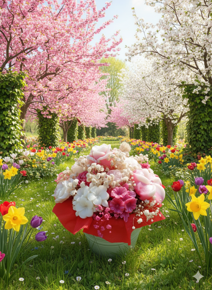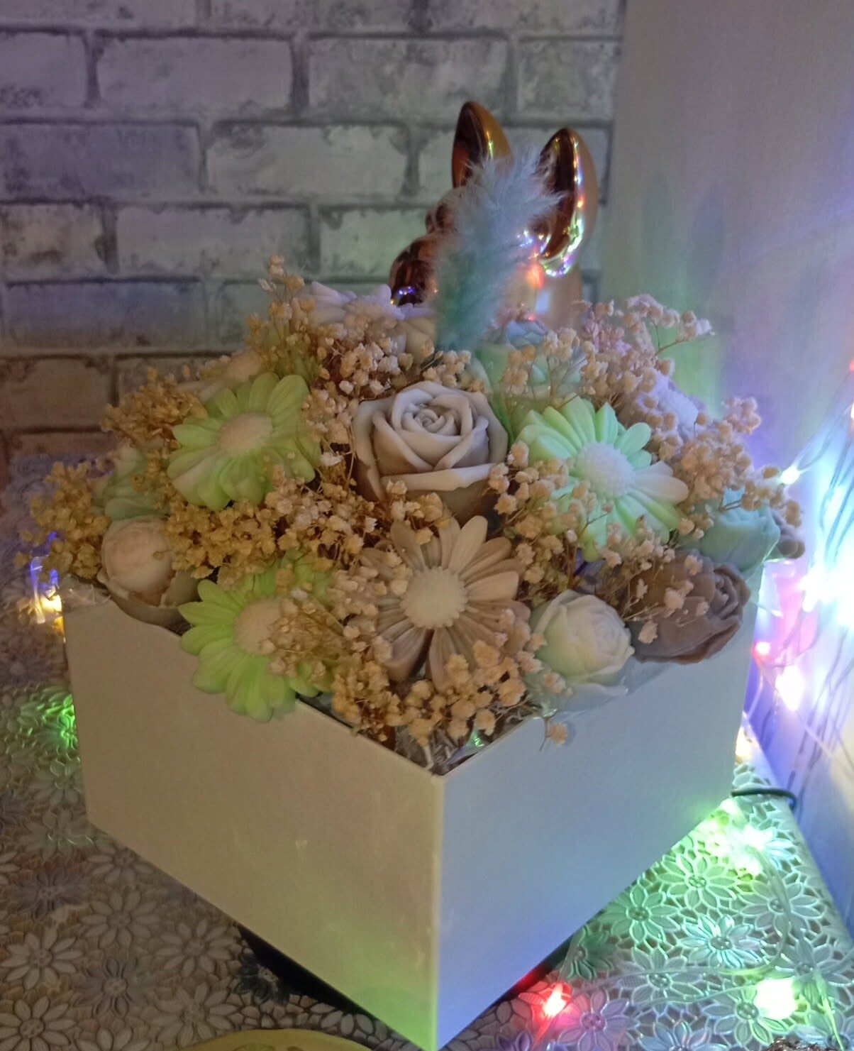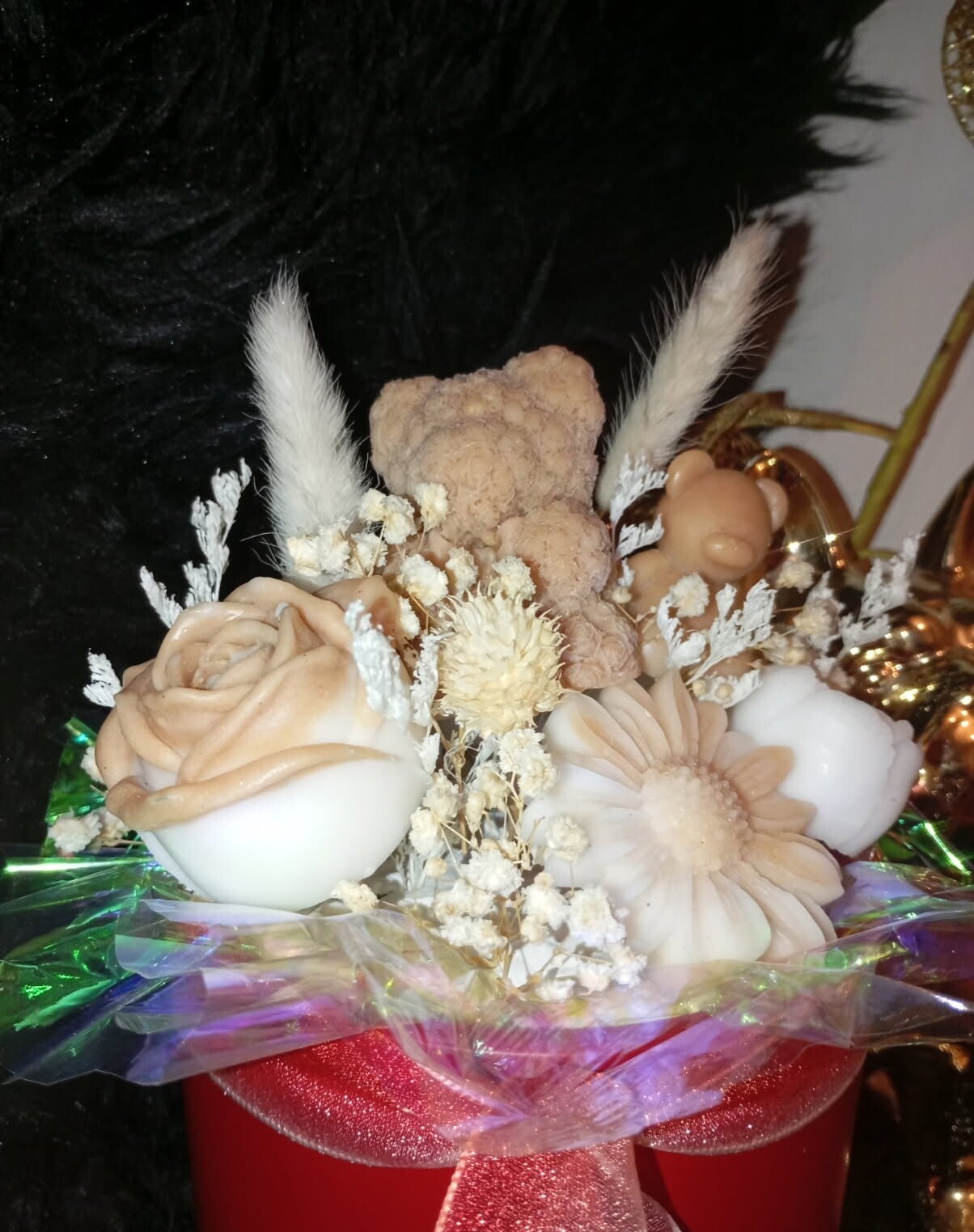 Une composition florale en cire : Chaque pétale de fleur de ce bouquet sont façonnés en cire végétale. La composition présente une harmonie de formes et de couleurs, avec de délicates roses, des marguerites et autres assortiment bicolores.