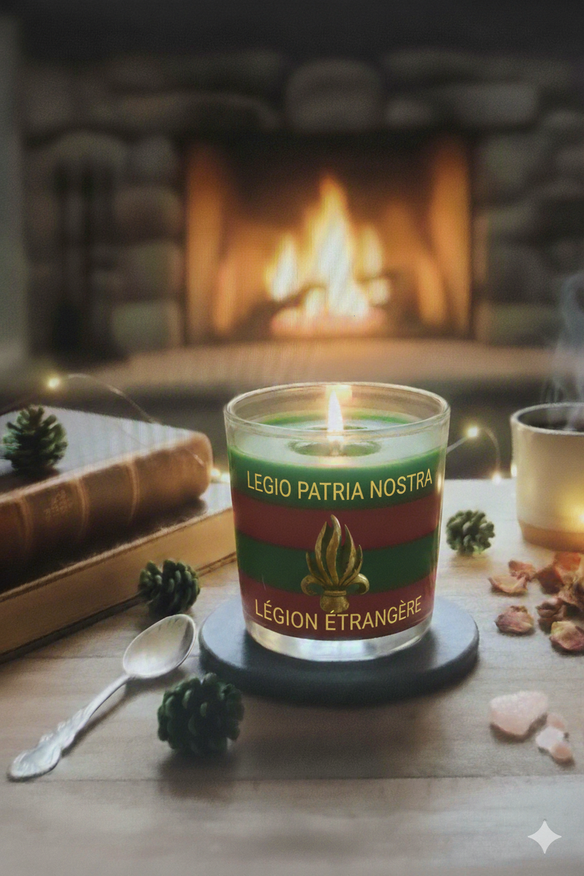 Ce que vous voyez est une bougie artisanale, créé avec soins composée de cire végétale et parfumée avec des essences de Grasse non toxiques, dans un verre transparent et décorée avec les couleurs de la Légion étrangère : le rouge et le vert.